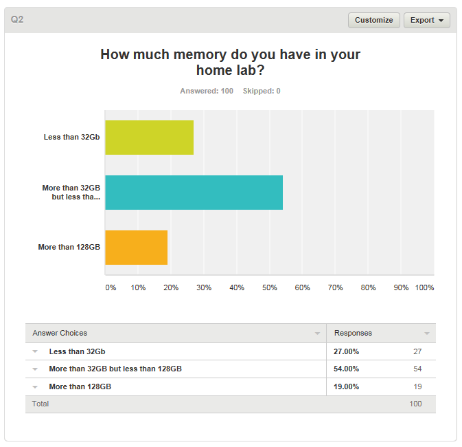 Having just added another 64GB 8 core SSD host to my lab I ran a survey to see what everyone else is doing. I thought this would be interesting to post so you can see what everyone else is doing. Please read the whole post because at the bottom my sponsor VMturbo has a competition to give away 3 x home labs. Click each picture to see the results.
